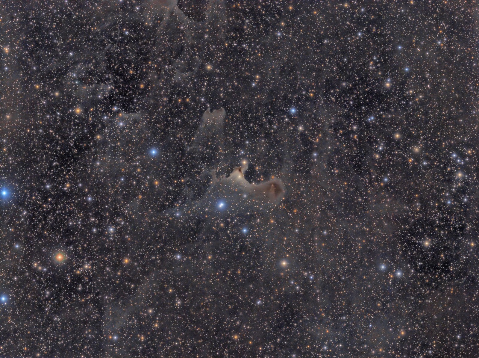 La Nebulosa del fantasma, vdB 141, es una nebulosa de reflexión con varias estrellas embebidas en ella. Estas estrellas provocan el peculiar tono marrón que se aprecia en la foto. Nubes de polvo cósmico apenas visibles en la tenue luz estelar reflejada.